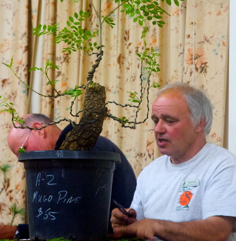 Members were treated to an entertaining and informative discussion about secondary and tertiary branch development in deciduous trees. David used several different trees to show how significant secondary branch growth could be achieved in as little as six weeks with judicious pruning. Add some wiring to create a foliage pad and you are well on your way to a new bonsai - see photos below.